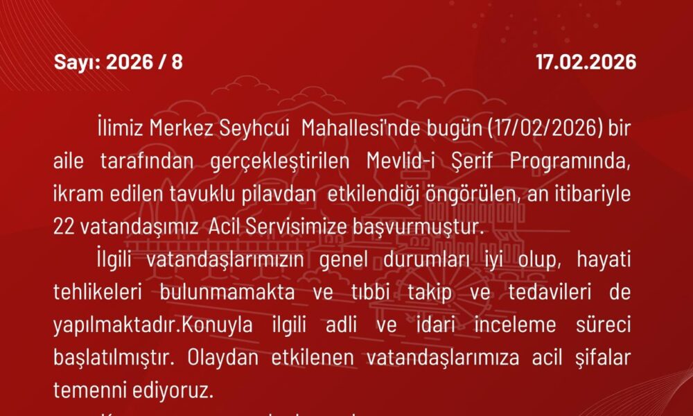 Amasya Valiliği tarafından yapılan açıklamada, “İlimiz merkez Seyhcui Mahallesi’nde bugün (17/02/2026) bir aile tarafından gerçekleştirilen Mevlid-i Şerif programında, ikram edilen tavuklu pilavdan etkilendiği öngörülen, an itibariyle 22 vatandaşımız acil servisimize başvurmuştur. İlgili vatandaşlarımızın genel durumları iyi olup, hayati tehlikeleri bulunmamakta ve tıbbi takip ve tedavileri de yapılmaktadır. Konuyla ilgili adli ve idari inceleme süreci başlatılmıştır. Olaydan etkilenen vatandaşlarımıza acil şifalar temenni ediyoruz” denildi.