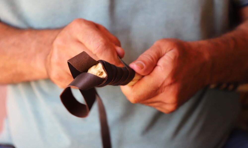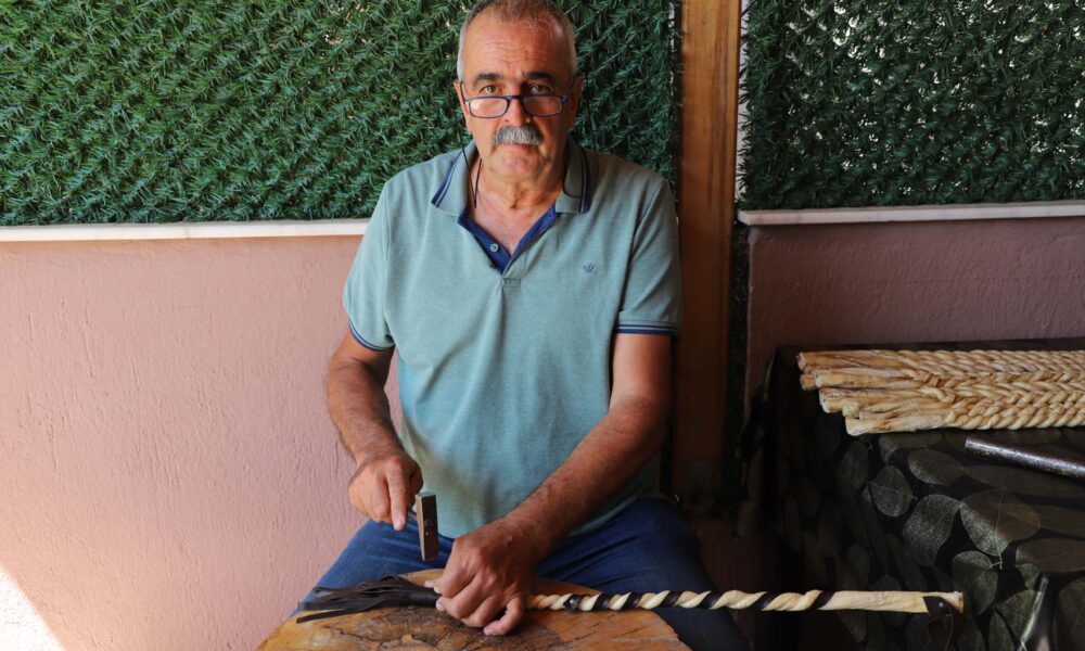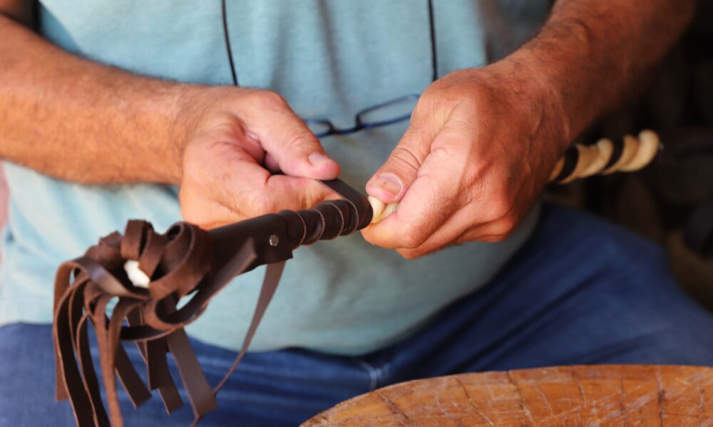 İzmir'in Urla ilçesinde yaşayan Nedim Artun (57), mezbahada kasaplık yaptığı yıllarda öğrendiği kamçı yapımını 26 yıldır sürdürüyor. Fotoğraf: Seza Nur ALPDÜNDAR/İzmir,(DHA)