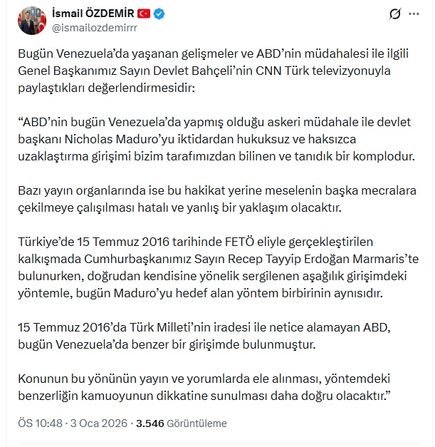 MHP’li Özdemir, Bahçeli’nin Venezuela’da gelişmelere ilişkin değerlendirmelerini paylaştı
