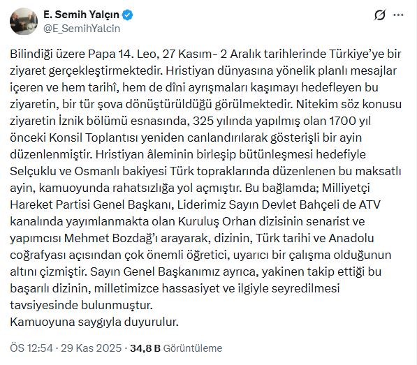MHP Genel Başkan Yardımcısı Semih Yalçın, sosyal medya hesabından yaptığı açıklamada, “Bilindiği üzere Papa 14üncü Leo, 27 Kasım-2 Aralık tarihlerinde Türkiyeye bir ziyaret gerçekleştirmektedir. Hristiyan dünyasına yönelik planlı mesajlar içeren ve hem tarihi, hem de dini ayrışmaları kaşımayı hedefleyen bu ziyaretin, bir tür şova dönüştürüldüğü görülmektedir. Nitekim söz konusu ziyaretin İznik bölümü esnasında, 325 yılında yapılmış olan 1700 yıl önceki Konsil toplantısı yeniden canlandırılarak gösterişli bir ayin düzenlenmiştir. Hristiyan aleminin birleşip bütünleşmesi hedefiyle Selçuklu ve Osmanlı bakiyesi Türk topraklarında düzenlenen bu maksatlı ayin, kamuoyunda rahatsızlığa yol açmıştır. Bu bağlamda, Milliyetçi Hareket Partisi Genel Başkanı, liderimiz Sayın Devlet Bahçeli de Kuruluş Orhan dizisinin senarist ve yapımcısı Mehmet Bozdağı arayarak, dizinin Türk tarihi ve Anadolu coğrafyası açısından çok önemli öğretici, uyarıcı bir çalışma olduğunun altını çizmiştir. Sayın Genel Başkanımız ayrıca, yakinen takip ettiği bu başarılı dizinin, milletimizce hassasiyet ve ilgiyle seyredilmesi tavsiyesinde bulunmuştur” ifadelerini kullandı.