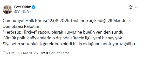 MHP Genel Başkan Yardımcısı Feti Yıldız, sosyal medya hesabından yaptığı paylaşımda, “Cumhuriyet Halk Partisi 12 Ağustos 2025 tarihinde açıkladığı 29 maddelik Demokrasi Paketini Terörsüz Türkiye raporu olarak TBMMye bugün yeniden sundu. Günlük politik söylemlerinin dışında süreçle ilgili yeni bir şey yok. Siyasetin sorumluluk gerektiren ciddi bir iş olduğunu unutuyoruz galiba” dedi.