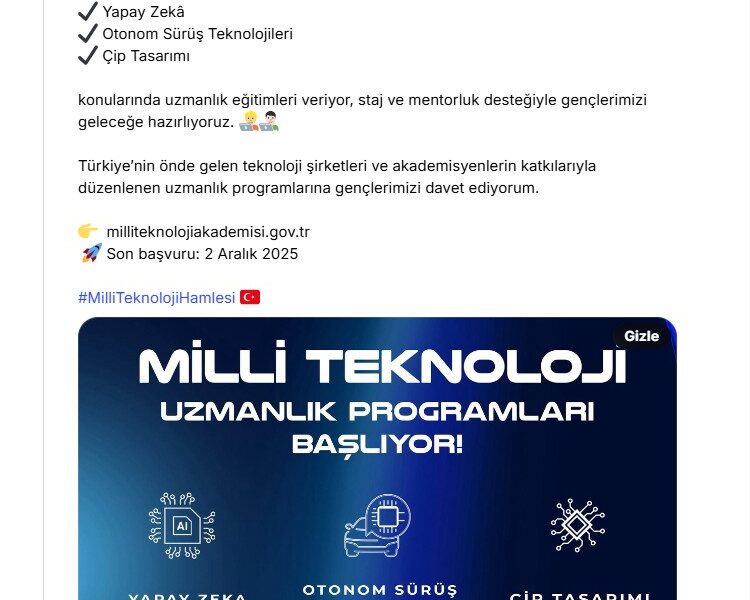Bakan Kacır, NSosyal hesabından yaptığı paylaşımda, “Üniversite öğrencileri için Milli Teknoloji Akademisi bünyesinde; yapay zeka, otonom sürüş teknolojileri, çip tasarımı konularında uzmanlık eğitimleri veriyor, staj ve mentorluk desteğiyle gençlerimizi geleceğe hazırlıyoruz. Türkiye’nin önde gelen teknoloji şirketleri ve akademisyenlerin katkılarıyla düzenlenen uzmanlık programlarına gençlerimizi davet ediyorum” dedi. Son başvuru tarihi 2 Aralık 2025 olan program hakkında detaylı bilgiye, milliteknolojiakademisi.gov.tr adresinden ulaşılabilecek.