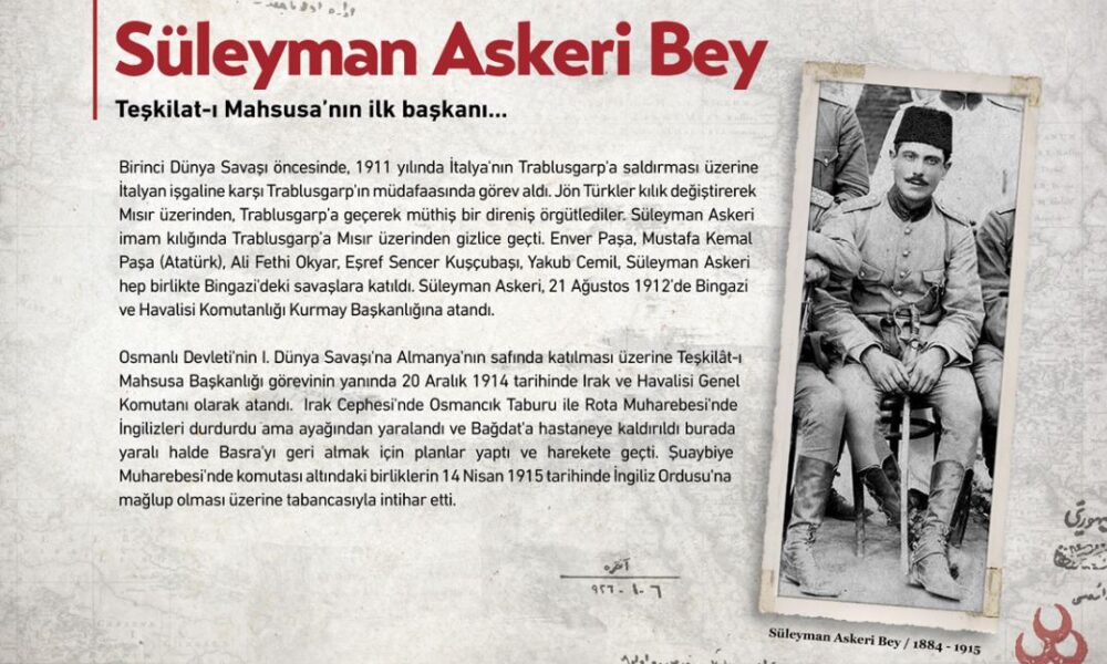 Teşkilat-ı Mahsusanın ilk başkanı Süleyman Askeri Beyin Trablusgarpa Molla Cemil adında sahte kimlikle giderek bölgede faaliyet yürüttüğü aktarıldı. Albümde, Süleyman Askeri Bey ile ilgili, “Birinci Dünya Savaşı öncesinde, 1911 yılında İtalyanın Trablusgarpa saldırması üzerine İtalyan işgaline karşı Trablusgarpın müdafaasında görev aldı. Jön Türkler kılık değiştirerek Mısır üzerinden, Trablusgarpa geçerek müthiş bir direniş örgütlediler. Süleyman Askeri imam kılığında Trablusgarpa Mısır üzerinden gizlice geçti. Enver Paşa, Mustafa Kemal Paşa (Atatürk), Ali Fethi Okyar, Eşref Sencer Kuşçubaşı, Yakub Cemil, Süleyman Askeri hep birlikte Bingazideki savaşlara katıldı. Süleyman Askeri, 21 Ağustos 1912de Bingazi ve Havalisi Komutanlığı Kurmay Başkanlığına atandı. Osmanlı Devletinin Birinci Dünya Savaşına Almanyanın safında katılması üzerine Teşkilat-ı Mahsusa Başkanlığı görevinin yanında 20 Aralık 1914 tarihinde Irak ve Havalisi Genel Komutanı olarak atandı. Irak Cephesinde Osmancık Taburu ile Rota Muharebesinde İngilizleri durdurdu ama ayağından yaralandı ve Bağdata hastaneye kaldırıldı, burada yaralı halde Basrayı geri almak için planlar yaptı ve harekete geçti. Şuaybiye Muharebesinde komutası altındaki birliklerin 14 Nisan 1915 tarihinde İngiliz Ordusuna mağlup olması üzerine tabancasıyla intihar etti” ifadelerine yer verildi.