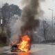 • Karabük'ün Safranbolu ilçesinde seyir halindeyken motor kısmından tutuşan otomobil alev alev yanarak kullanılamaz hale geldi.. Fotoğraf: Karabük(Safranbolu) , (DHA)