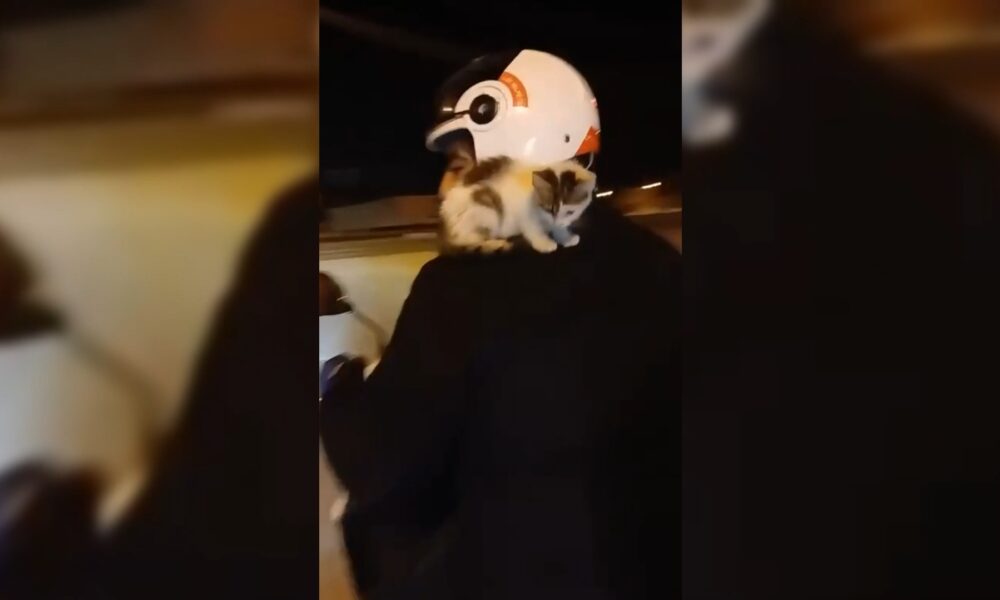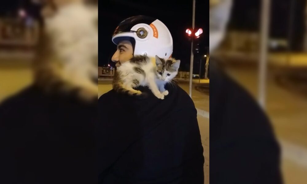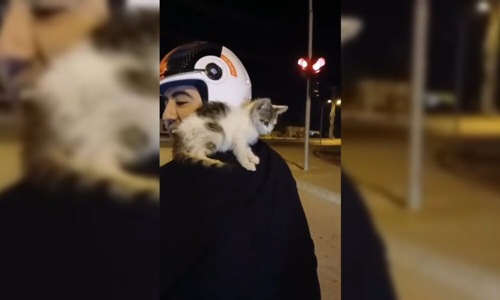 Motosiklet sürücüsü yolda bulduğu yavru kediyi sahiplenip omzunda eve götürdü