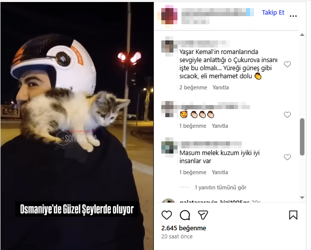 Fakıuşağı Mahallesi’nden kent merkezine giden motosiklet sürücüsünün omzunda yavru kediyle yolculuk yaptığını gören bir kişi, bu anları cep telefonuyla görüntüledi. Kayıt yapan kişi sürücüye yaklaşarak, “İsmi ne bu sevimlinin bakalım?” diye sordu. Motosiklet sürücüsü ise “Ağabey bilmiyorum vallahi. Karnı açtı, ben de aldım sahiplendim, beslemek üzere eve götürüyorum” dedi. Bunun üzerine videoyu çeken kişi de “Allah’ına kurban senin, bunun sevabı sana yeter” sözleriyle sürücünün davranışını takdir etti. Motosikletli genç, kedinin düşmemesi için bir süre sonra, “Ağabey bunu elime versene, düşmesin orada” diyerek yavru kediyi montunun içine yerleştirip yoluna devam etti. Sosyal medyada paylaşılan görüntüler kısa sürede beğeni topladı. Çok sayıda kullanıcı yorumlarıyla, hayvansever sürücüyü davranışı nedeniyle tebrik etti.