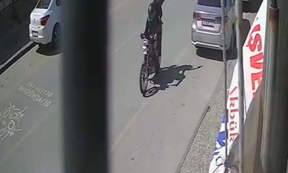 Motosikletli 2 kişinin iş yerine peş peşe ateş ettiği anlar bir iş yerinin güvenlik kamerasına yansıdı.