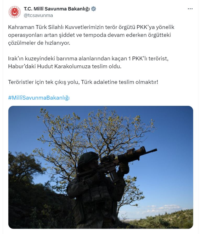 Bakanlığın sosyal medya hesabından yapılan açıklamada, “Kahraman Türk Silahlı Kuvvetlerimizin terör örgütü PKKya yönelik operasyonları artan şiddet ve tempoda devam ederken örgütteki çözülmeler de hızlanıyor. Irakın kuzeyindeki barınma alanlarından kaçan 1 PKKlı terörist, Haburdaki hudut karakolumuza teslim oldu. Teröristler için tek çıkış yolu, Türk adaletine teslim olmaktır” denildi.