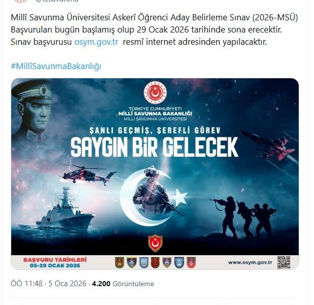 Milli Savunma Üniversitesinin (MSÜ) sanal medya hesabından yapılan açıklamada ise “Beklenen an geldi. 2026-MSÜ başvuruları başladı. Hayallerine giden yolda ilk adımı at ve şanlı üniformayı giymek için başvurunu yap. Başvurunu 5-29 Ocak 2026 tarihleri arasında ÖSYMnin internet sitesinden yapabilirsin” ifadelerine yer verildi.