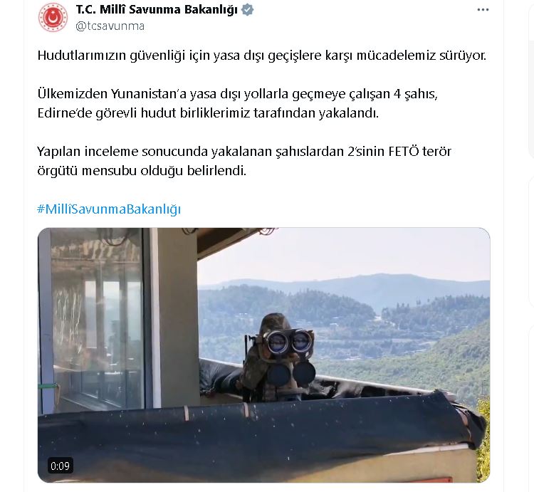Bakanlığın sosyal medya hesabından yapılan açıklamada, “Hudutlarımızın güvenliği için yasa dışı geçişlere karşı mücadelemiz sürüyor. Ülkemizden Yunanistana yasa dışı yollarla geçmeye çalışan 4 şahıs, Edirnede görevli hudut birliklerimiz tarafından yakalandı. Yapılan inceleme sonucunda yakalanan şahıslardan 2sinin FETÖ terör örgütü mensubu olduğu belirlendi” denildi.