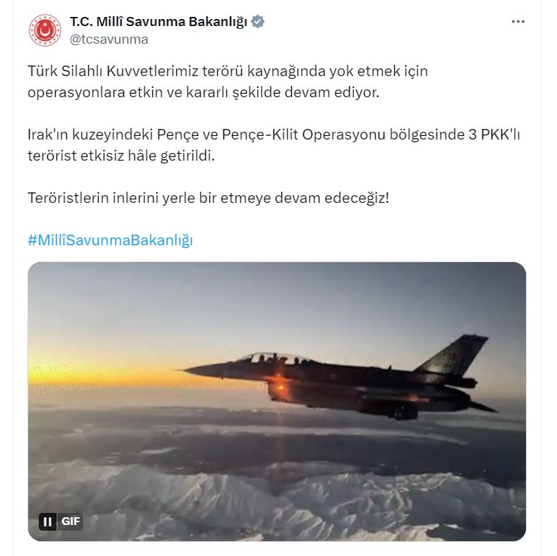 MİLLİ Savunma Bakanlığı (MSB), Irakın kuzeyindeki Pençe ve Pençe-Kilit Operasyonu bölgesinde 3 PKKlı teröristin etkisiz hale getirildiğini açıkladı.Bakanlığın sosyal medya hesabından yapılan açıklamada, “Türk Silahlı Kuvvetlerimiz terörü kaynağında yok etmek için operasyonlara etkin ve kararlı şekilde devam ediyor. Irakın kuzeyindeki Pençe ve Pençe-Kilit Operasyonu bölgesinde 3 PKKlı terörist etkisiz hale getirildi. Teröristlerin inlerini yerle bir etmeye devam edeceğiz” denildi.