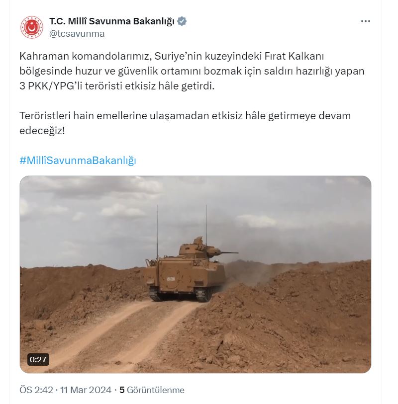 MİLLİ Savunma Bakanlığı (MSB), Suriyenin kuzeyindeki Fırat Kalkanı bölgesinde huzur ve güvenlik ortamını bozmak için saldırı hazırlığı yapan 3 PKK/YPGli teröristin etkisiz hale getirildiğini açıkladı.Bakanlığın sosyal medya hesabından yapılan açıklamada, “Kahraman komandolarımız, Suriyenin kuzeyindeki Fırat Kalkanı bölgesinde huzur ve güvenlik ortamını bozmak için saldırı hazırlığı yapan 3 PKK/YPGli teröristi etkisiz hale getirdi. Teröristleri hain emellerine ulaşamadan etkisiz hale getirmeye devam edeceğiz” denildi.
