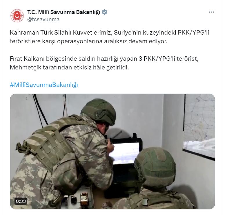 MİLLİ Savunma Bakanlığı (MSB), Fırat Kalkanı bölgesinde saldırı hazırlığı yapan 3 PKK/YPGli teröristin, Mehmetçik tarafından etkisiz hale getirildiğini duyurdu.Bakanlığın sosyal medya hesabından yapılan açıklamada, “Kahraman Türk Silahlı Kuvvetlerimiz, Suriyenin kuzeyindeki PKK/YPGli teröristlere karşı operasyonlarına aralıksız devam ediyor. Fırat Kalkanı bölgesinde saldırı hazırlığı yapan 3 PKK/YPGli terörist, Mehmetçik tarafından etkisiz hale getirildi” denildi.