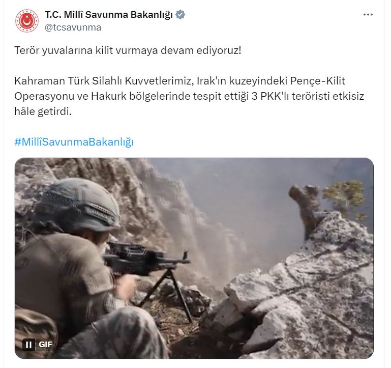 Bakanlığın sosyal medya hesabından yapılan açıklamada, “Terör yuvalarına kilit vurmaya devam ediyoruz! Kahraman Türk Silahlı Kuvvetlerimiz, Irakın kuzeyindeki Pençe-Kilit Operasyonu ve Hakurk bölgelerinde tespit ettiği 3 PKKlı teröristi etkisiz hale getirdi” denildi.