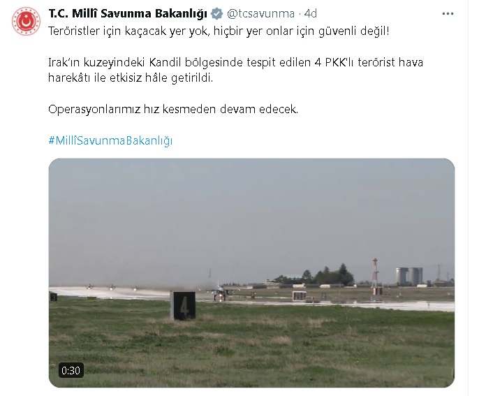 Bakanlığın sosyal medya hesabından yapılan açıklamada, “Teröristler için kaçacak yer yok, hiçbir yer onlar için güvenli değil. Irak’ın kuzeyindeki Kandil bölgesinde tespit edilen 4 PKKlı terörist hava harekatı ile etkisiz hale getirildi. Operasyonlarımız hız kesmeden devam edecek” denildi.
