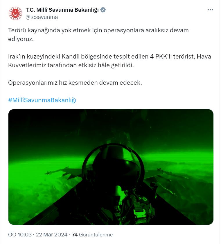 MİLLİ Savunma Bakanlığı (MSB), Irakın kuzeyindeki Kandil bölgesinde tespit edilen 4 PKKlı teröristin, Hava Kuvvetleri tarafından etkisiz hale getirildiğini açıkladı.Bakanlığın sosyal medya hesabından yapılan açıklamada, “Terörü kaynağında yok etmek için operasyonlara aralıksız devam ediyoruz. Irakın kuzeyindeki Kandil bölgesinde tespit edilen 4 PKKlı terörist, Hava Kuvvetlerimiz tarafından etkisiz hale getirildi. Operasyonlarımız hız kesmeden devam edecek” denildi.
