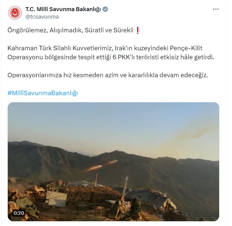 Bakanlığın sosyal medya hesabından yapılan açıklamada, “Öngörülemez, alışılmadık, süratli ve sürekli. Kahraman Türk Silahlı Kuvvetlerimiz, Irakın kuzeyindeki Pençe-Kilit Operasyonu bölgesinde tespit ettiği 6 PKKlı teröristi etkisiz hale getirdi. Operasyonlarımıza hız kesmeden azim ve kararlılıkla devam edeceğiz” denildi.