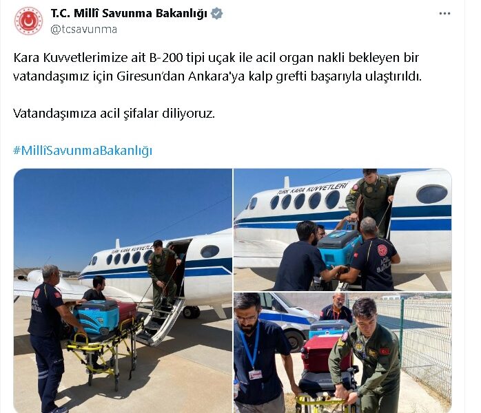 Bakanlığın sosyal medya hesabından yapılan açıklamada, “Kara Kuvvetlerimize ait B-200 tipi uçak ile acil organ nakli bekleyen bir vatandaşımız için Giresun’dan Ankaraya kalp grefti başarıyla ulaştırıldı. Vatandaşımıza acil şifalar diliyoruz” denildi.