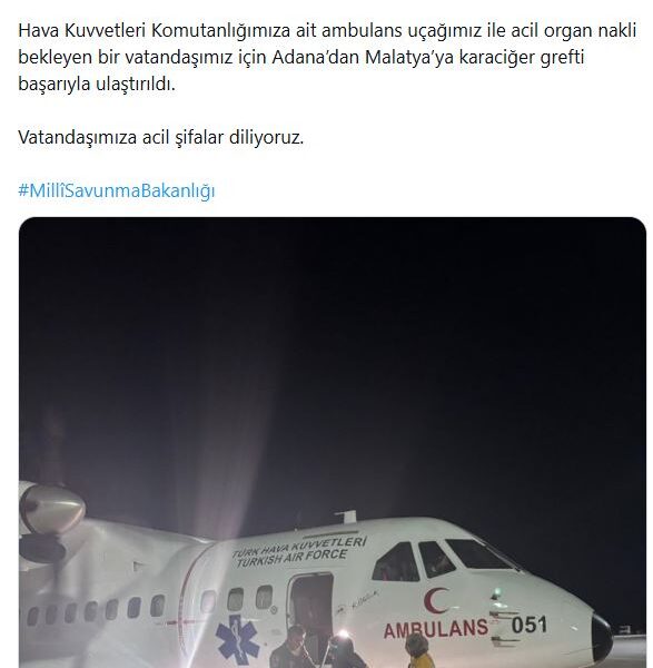 MSBnin sosyal medya hesabından yapılan açıklamada, “Hava Kuvvetleri Komutanlığımıza ait ambulans uçağımız ile acil organ nakli bekleyen bir vatandaşımız için Adana’dan Malatya’ya karaciğer grefti başarıyla ulaştırıldı. Vatandaşımıza acil şifalar diliyoruz” ifadelerine yer verildi.