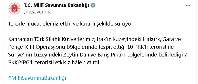 Bakanlığın sosyal medya hesabından yapılan açıklamada, “Terörle mücadelemiz etkin ve kararlı şekilde sürüyor. Kahraman Türk Silahlı Kuvvetlerimiz; Irakın kuzeyindeki Hakurk, Gara ve Pençe-Kilit Operasyonu bölgelerinde tespit ettiği 10 PKKlı terörist ile Suriyenin kuzeyindeki Zeytin Dalı ve Barış Pınarı bölgelerinde belirlediği 7 PKK/YPGli teröristi etkisiz hale getirdi” denildi.