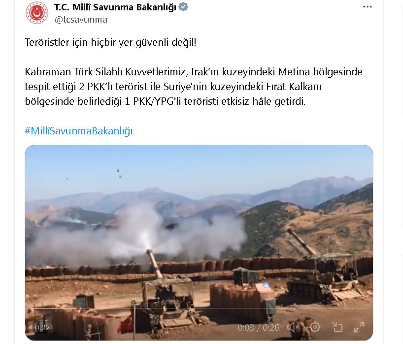 Bakanlığın sosyal medya hesabından yapılan açıklamada, “Teröristler için hiçbir yer güvenli değil. Kahraman Türk Silahlı Kuvvetlerimiz, Irakın kuzeyindeki Metina bölgesinde tespit ettiği 2 PKKlı terörist ile Suriyenin kuzeyindeki Fırat Kalkanı bölgesinde belirlediği 1 PKK/YPGli teröristi etkisiz hale getirdi” denildi.