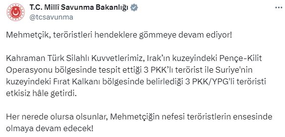 Bakanlığın sosyal medya hesabından yapılan açıklamada, “Kahraman Türk Silahlı Kuvvetlerimiz, Irakın kuzeyindeki Pençe-Kilit Operasyonu bölgesinde tespit ettiği 3 PKKlı terörist ile Suriyenin kuzeyindeki Fırat Kalkanı bölgesinde belirlediği 3 PKK/YPGli teröristi etkisiz hale getirdi. Her nerede olursa olsunlar, Mehmetçiğin nefesi teröristlerin ensesinde olmaya devam edecek” denildi.