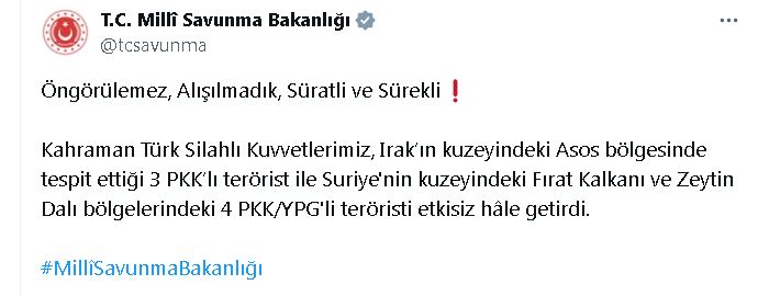 Bakanlığın sosyal medya hesabından yapılan açıklamada, “Öngörülemez, alışılmadık, süratli ve sürekli. Kahraman Türk Silahlı Kuvvetlerimiz, Irakın kuzeyindeki Asos bölgesinde tespit ettiği 3 PKKlı terörist ile Suriyenin kuzeyindeki Fırat Kalkanı ve Zeytin Dalı bölgelerindeki 4 PKK/YPGli teröristi etkisiz hale getirdi” denildi.