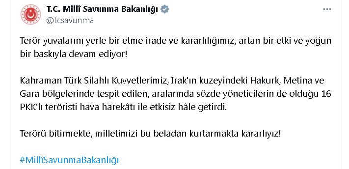 Bakanlığın sosyal medya hesabından yapılan açıklamada, “Terör yuvalarını yerle bir etme irade ve kararlılığımız, artan bir etki ve yoğun bir baskıyla devam ediyor. Kahraman Türk Silahlı Kuvvetlerimiz, Irakın kuzeyindeki Hakurk, Metina ve Gara bölgelerinde tespit edilen, aralarında sözde yöneticilerin de olduğu 16 PKKlı teröristi hava harekatı ile etkisiz hale getirdi. Terörü bitirmekte, milletimizi bu beladan kurtarmakta kararlıyız” denildi.
