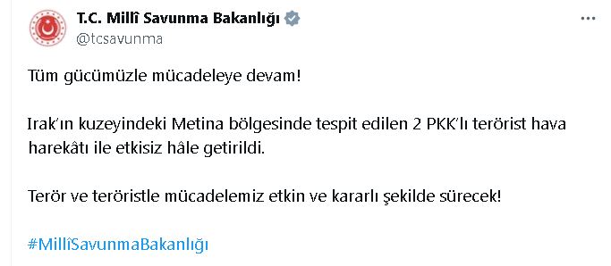 Bakanlığın sosyal medya hesabından yapılan açıklamada, “Tüm gücümüzle mücadeleye devam. Irakın kuzeyindeki Metina bölgesinde tespit edilen 2 PKKlı terörist hava harekatı ile etkisiz hale getirildi. Terör ve teröristle mücadelemiz etkin ve kararlı şekilde sürecek” denildi.