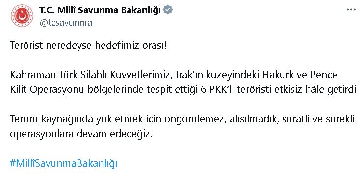 Bakanlığın sosyal medya hesabından yapılan açıklamada, “Terörist neredeyse hedefimiz orası. Kahraman Türk Silahlı Kuvvetlerimiz, Irakın kuzeyindeki Hakurk ve Pençe-Kilit Operasyonu bölgelerinde tespit ettiği 6 PKKlı teröristi etkisiz hale getirdi. Terörü kaynağında yok etmek için öngörülemez, alışılmadık, süratli ve sürekli operasyonlara devam edeceğiz” denildi.