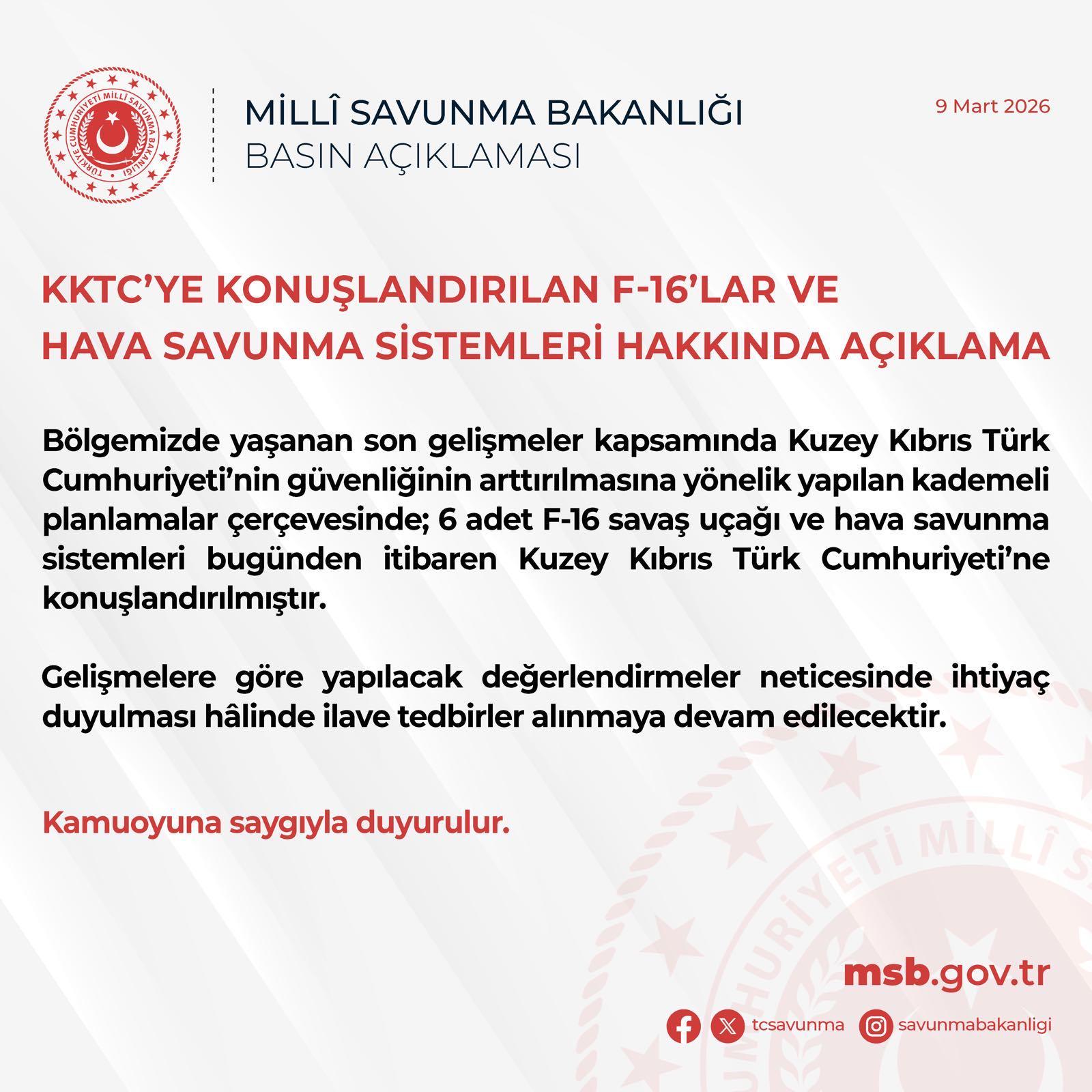 Bakanlıktan yapılan yazılı açıklamada, “Bölgemizde yaşanan son gelişmeler kapsamında KKTC’nin güvenliğinin artırılmasına yönelik yapılan kademeli planlamalar çerçevesinde; 6 adet F-16 savaş uçağı ve hava savunma sistemleri bugünden itibaren KKTC’ye konuşlandırılmıştır. Gelişmelere göre yapılacak değerlendirmeler neticesinde ihtiyaç duyulması halinde ilave tedbirler alınmaya devam edilecektir” ifadelerine yer verildi.
