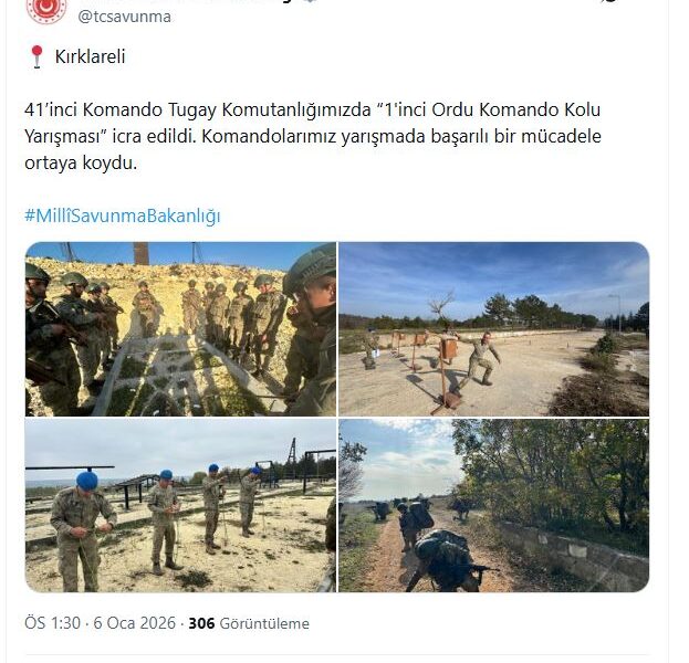 Milli Savunma Bakanlığı, 41nci Komando Tugay Komutanlığında komando kolu yarışması icra edildiğini duyurdu. Bakanlığın sanal medya hesabından yapılan paylaşımda, “41’inci Komando Tugay Komutanlığımızda 1inci Ordu Komando Kolu Yarışması icra edildi. Komandolarımız yarışmada başarılı bir mücadele ortaya koydu” denildi. Paylaşımda, komandoların yarışma sırasında çekilen fotoğraflarına da yer verildi.