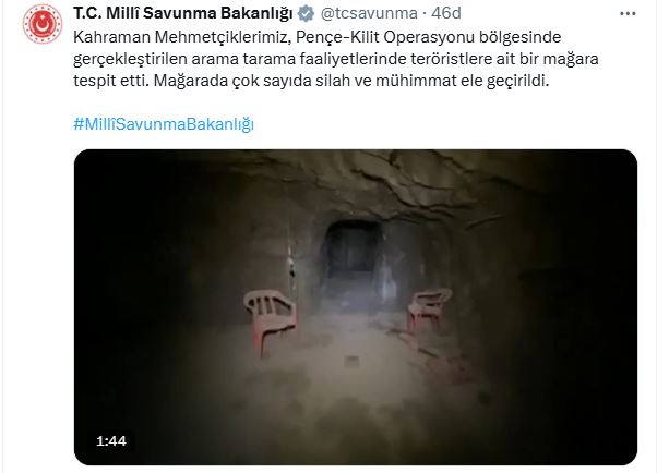 Bakanlığın sosyal medya hesabından yapılan açıklamada, “Kahraman Mehmetçiklerimiz, Pençe-Kilit Operasyonu bölgesinde gerçekleştirilen arama tarama faaliyetlerinde teröristlere ait bir mağara tespit etti. Mağarada çok sayıda silah ve mühimmat ele geçirildi” denildi.