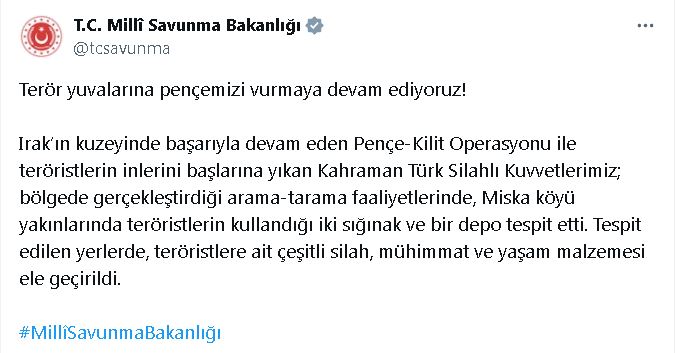 Bakanlığın sosyal medya hesabından yapılan açıklamada, “Terör yuvalarına pençemizi vurmaya devam ediyoruz. Irakın kuzeyinde başarıyla devam eden Pençe-Kilit Operasyonu ile teröristlerin inlerini başlarına yıkan Kahraman Türk Silahlı Kuvvetlerimiz; bölgede gerçekleştirdiği arama tarama faaliyetlerinde, Miska köyü yakınlarında teröristlerin kullandığı iki sığınak ve bir depo tespit etti. Tespit edilen yerlerde, teröristlere ait çeşitli silah, mühimmat ve yaşam malzemesi ele geçirildi” denildi.