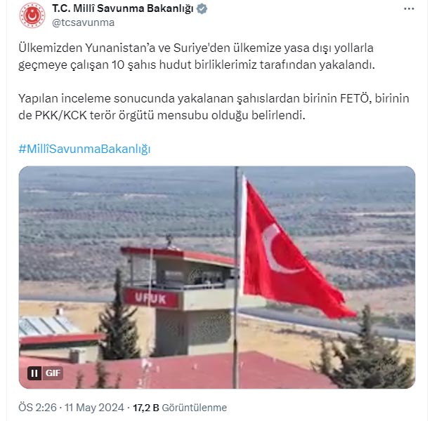 Bakanlığın sosyal medya hesabından yapılan açıklamada, “Ülkemizden Yunanistan’a ve Suriyeden ülkemize yasa dışı yollarla geçmeye çalışan 10 şahıs hudut birliklerimiz tarafından yakalandı. Yapılan inceleme sonucunda yakalanan şahıslardan 1inin FETÖ, 1inin de PKK/KCK terör örgütü mensubu olduğu belirlendi” denildi.