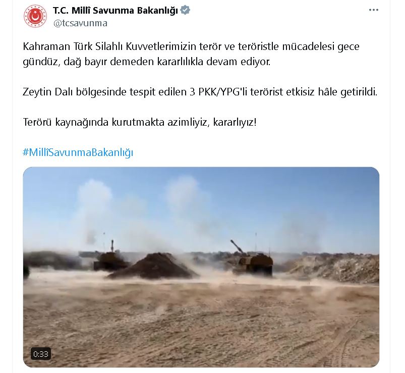 Bakanlığın sosyal medya hesabından yapılan açıklamada, “Kahraman Türk Silahlı Kuvvetlerimizin terör ve teröristle mücadelesi gece gündüz, dağ bayır demeden kararlılıkla devam ediyor. Zeytin Dalı bölgesinde tespit edilen 3 PKK/YPGli terörist etkisiz hale getirildi. Terörü kaynağında kurutmakta azimliyiz, kararlıyız” denildi.