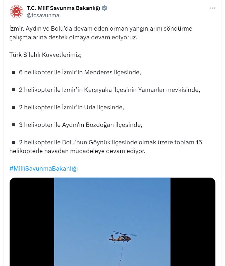 Bakanlığın sosyal medya hesabından yapılan açıklamada, “İzmir, Aydın ve Boluda devam eden orman yangınlarını söndürme çalışmalarına destek olmaya devam ediyoruz. Türk Silahlı Kuvvetlerimiz; 6 helikopter ile İzmirin Menderes ilçesinde, 2 helikopter ile İzmirin Karşıyaka ilçesinin Yamanlar mevkisinde, 2 helikopter ile İzmirin Urla ilçesinde, 3 helikopter ile Aydının Bozdoğan ilçesinde, 2 helikopter ile Bolunun Göynük ilçesinde olmak üzere toplam 15 helikopterle havadan mücadeleye devam ediyor” denildi.