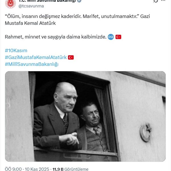 Bakanlığın sosyal medya hesabından Gazi Mustafa Kemal Atatürkün 87nci vefat yıl dönümü nedeniyle video paylaşıldı. Atatürkün Ölüm, insanın değişmez kaderidir. Marifet, unutulmamaktır sözü ve Rahmet, minnet ve saygıyla daima kalbimizde notuyla paylaşılan videoda Atatürkün farklı görüntüleri, vatandaşlarla bir araya geldiği anları, geçmişte Anıtkabirde yapılan anma törenlerine ait görüntüler ile TEKNOFESTlerde gençlerin savunma sanayi ürünlerini incelerken görüntüleri yer aldı. Videoda, “Bir lider vardı, sözleri yüz yılı aşan, ışığı hiç sönmeyen, bir 10 Kasım daha aynı sessizlik, aynı hüzün, aynı minnet. Bir kaybı değil, bir mirası hatırlıyoruz. Düşünceleriyle çağının ötesine geçen bir adamı. Bir ulusa yalnızca özgürlüğü değil, kendi geleceğini kurma cesaretini veren bir yol göstericiyi. O, umudun ne demek olduğunu öğretti bu millete. En büyük eserim dediği Cumhuriyeti bizlere emanet etti. Her taşı alın teriyle, her satırı cesaretle yazılmış bir hikayeyi geleceğe taşıma sorumluluğunu verdi. Atatürk; adı geçmişte değil, geleceğin tam kalbinde duran. Çünkü Atatürk, yalnızca bir tarihin değil, bir geleceğin adıdır. 10 Kasım Atatürkü anmak değil Atatürkü anlamaktır” ifadeleri yer aldı.
