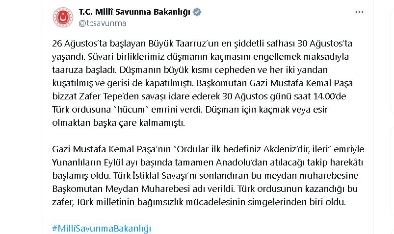 Paylaşımda, 26 Ağustosta başlayan Büyük Taarruzun en şiddetli safhasının 30 Ağustosta yaşandığı belirtilerek, “Süvari birliklerimiz düşmanın kaçmasını engellemek maksadıyla taaruza başladı. Düşmanın büyük kısmı cepheden ve her iki yandan kuşatılmış ve gerisi de kapatılmıştı. Başkomutan Gazi Mustafa Kemal Paşa, bizzat Zafer Tepeden savaşı idare ederek 30 Ağustos günü saat 14.00te Türk ordusuna hücum emrini verdi. Düşman için kaçmak veya esir olmaktan başka çare kalmamıştı. Gazi Mustafa Kemal Paşanın, Ordular ilk hedefiniz Akdenizdir, ileri emriyle Yunanlıların eylül ayı başında tamamen Anadoludan atılacağı takip harekatı başlamış oldu. Türk İstiklal Savaşını sonlandıran bu meydan muharebesine Başkomutan Meydan Muharebesi adı verildi. Türk ordusunun kazandığı bu zafer, Türk milletinin bağımsızlık mücadelesinin simgelerinden biri oldu” denildi.