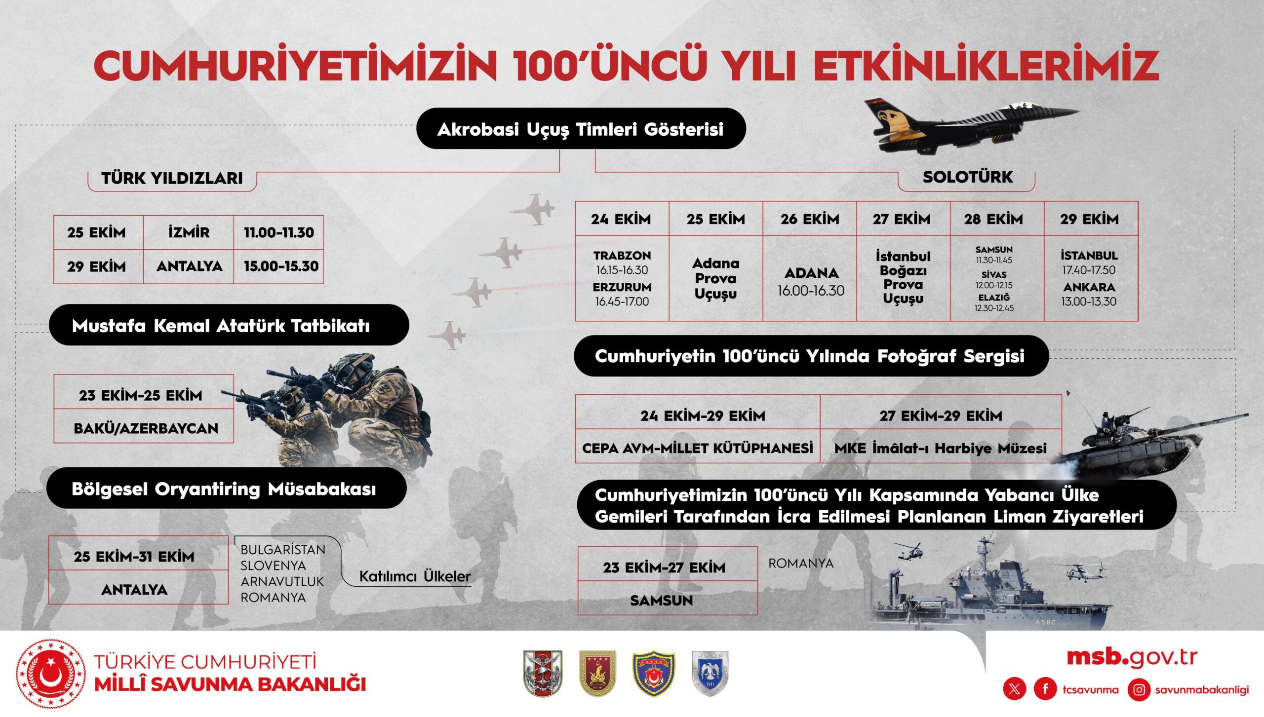 Cumhuriyetin 100’üncü yılı kutlamaları kapsamında, Hava Kuvvetlerinin gösteri ekipleri olan Solotürk ve Türk Yıldızları da 24-29 Ekim 2023 tarihleri arasında pek çok kentte uçuşlar gerçekleştirecek. Solotürk; 24 Ekim’de Trabzon ve Erzurum’da, 25-26 Ekim’de Adana’da, 27 Ekim’de İstanbul Boğazı’nda, 28 Ekim’de Samsun, Sivas ve Elazığ’da, 29 Ekim’de de İstanbul ve Ankara’da gösteri uçuşları yapacak. Türk Yıldızları da 25 Ekim’de İzmir’de, 29 Ekim’de Antalya’da gösteri yapacak.