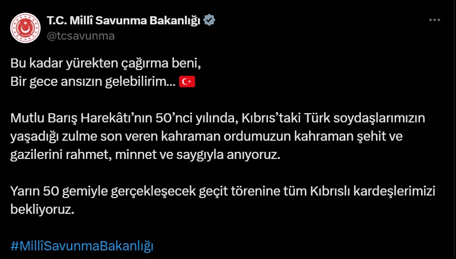 Ayrıca, bakanlıktan yapılan açıklamada, “Bu kadar yürekten çağırma beni/Bir gece ansızın gelebilirim. Mutlu Barış Harekatının 50nci yılında, Kıbrıstaki Türk soydaşlarımızın yaşadığı zulme son veren kahraman ordumuzun, kahraman şehit ve gazilerini rahmet, minnet ve saygıyla anıyoruz. Yarın 50 gemiyle gerçekleşecek geçit törenine tüm Kıbrıslı kardeşlerimizi bekliyoruz” denildi.