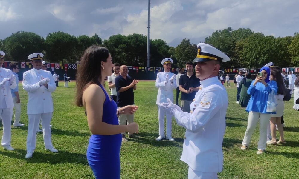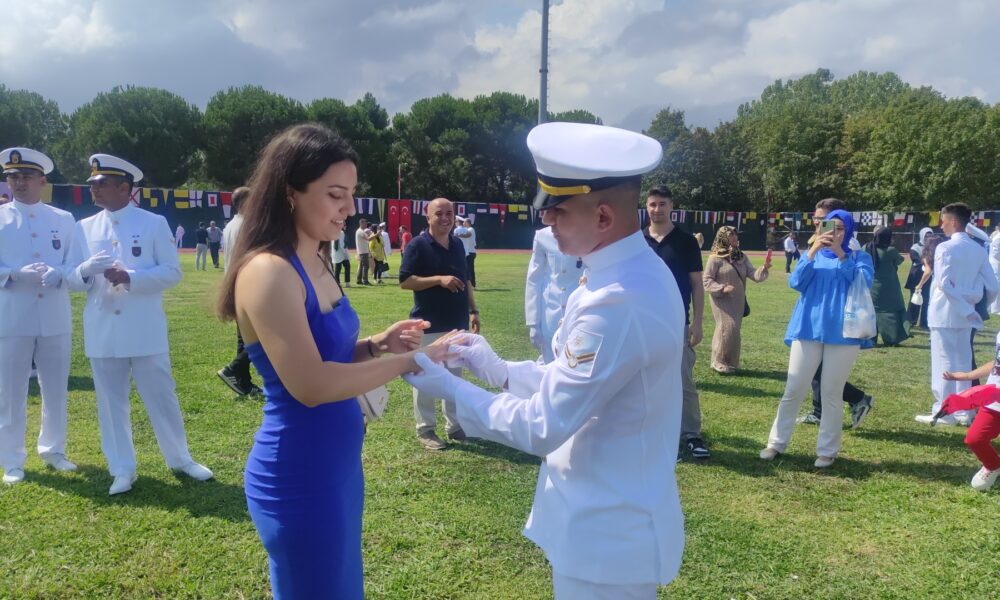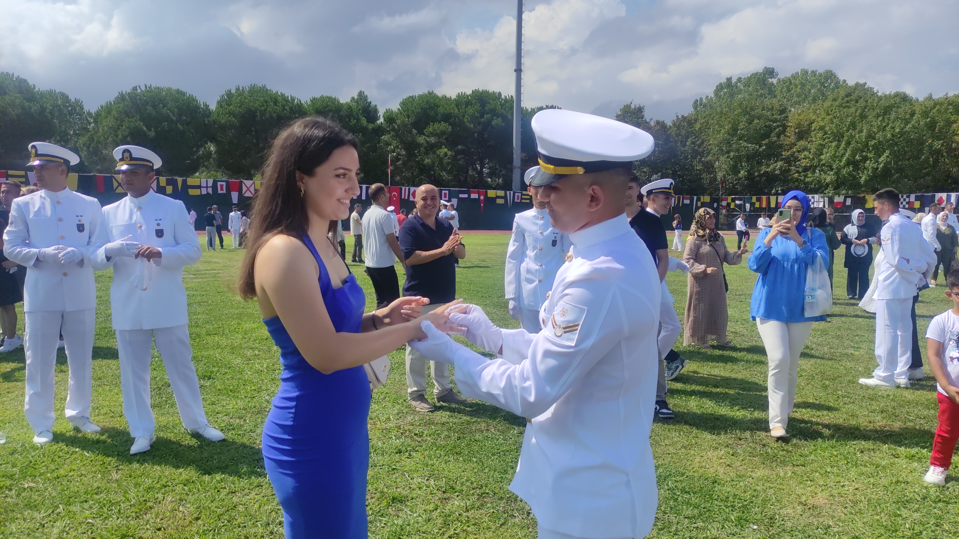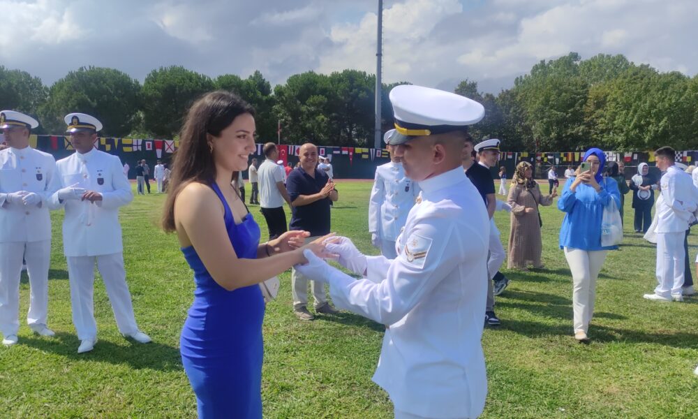 Milli Savunma Üniversitesi Deniz Astsubay Meslek Yüksekokulu Diploma ve Sancak Devir Teslim Töreni, dün Yalova’nın Altınova ilçesindeki Karamürselbey Eğitim Merkezi Komutanlığında yapıldı. Milli Savunma Bakanı Yaşar Güler, Genelkurmay Başkanı Orgeneral Metin Gürak, Yalova Valisi Hülya Kaya, Deniz Kuvvetleri Komutanı Oramiral Ercüment Tatlıoğlu, Milli Savunma Üniversitesi Rektörü Prof. Dr. Erhan Afyoncu ile Yalova Üniversitesi Rektörü Prof. Dr. Mehmet Bahçekapılı’nın katıldığı törende, 8i Kuzey Kıbrıs, 8i Libya ve 8i Senegalli olmak üzere toplamda 496 öğrenci diplomalarını alıp, ant içti. Törenin ardından alana alınan aileler, mezun olan çocuklarıyla kucaklaştı. 134’üncü dönem mezunlarından Astsubay Çavuş Yusuf Ateş ise kız arkadaşı Hurenur Eroğlu’na evlilik teklifinde bulundu. ‘Evet’ yanıtını alan astsubay, müstakbel eşinin parmağına nişan yüzüğünü de tören alanında taktı.