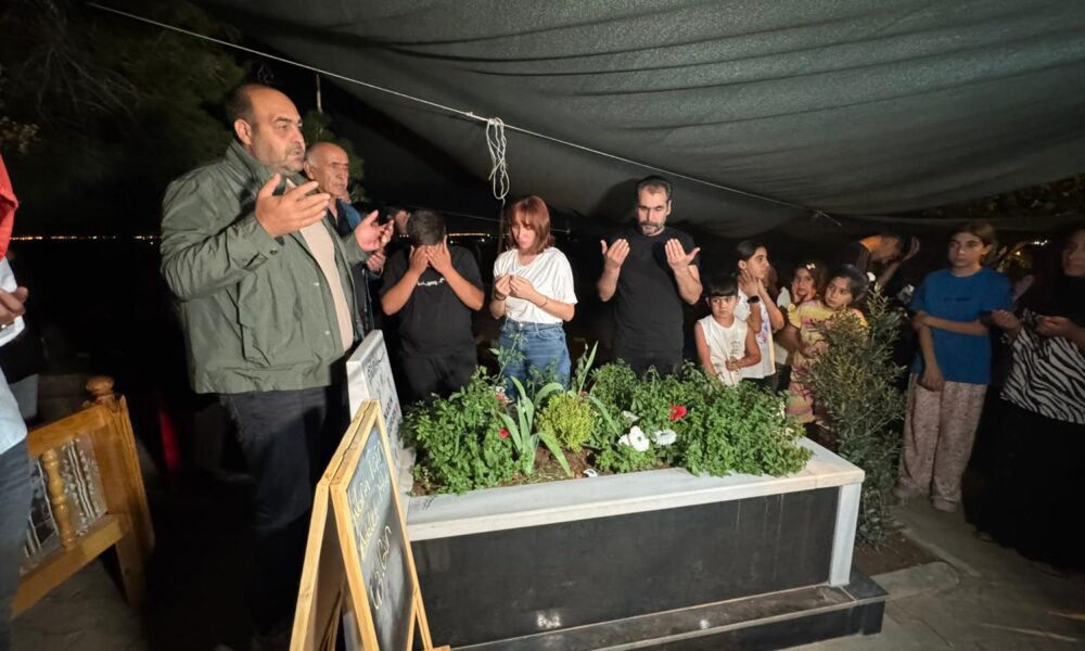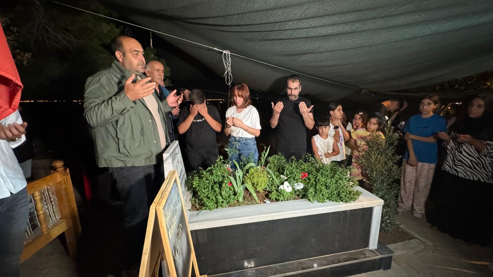 Diyarbakır'da Narin Güran cinayeti davasında tahliye edilen Birsen, (beyaz tşörtlü) Fuat (Birsen'in sağında)ve Maşallah Güran, Narin Güran’ın Tavşantepe Mahallesi’ndeki mezarı başına gelerek gözyaşları içerisinde dua etti. Fotoğraf: Diyarbakır,(DHA)