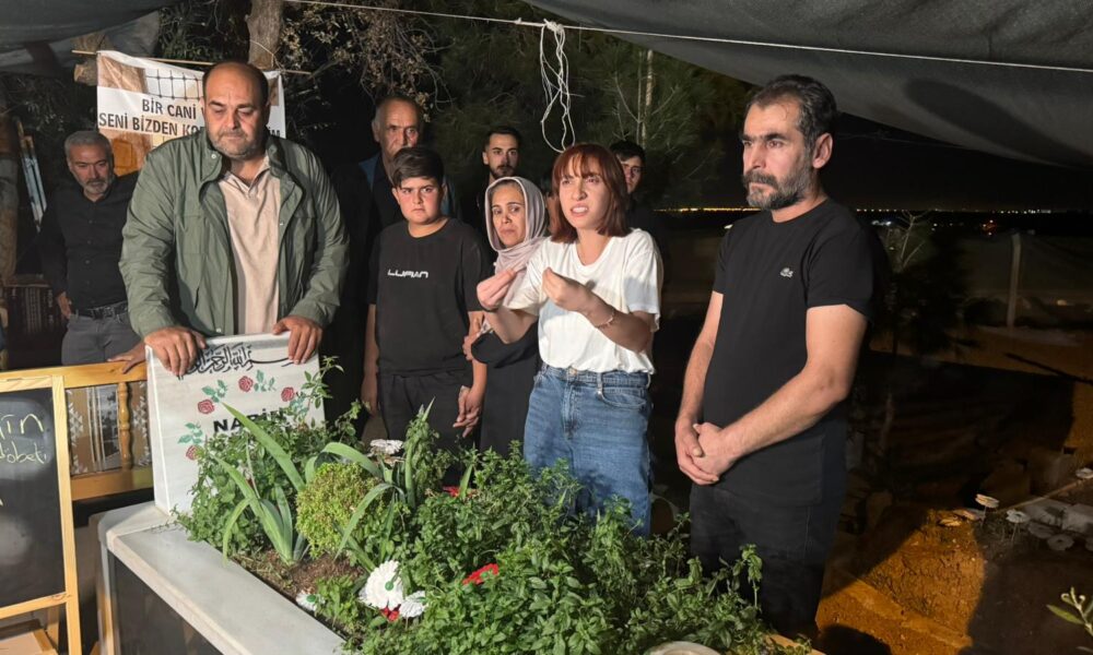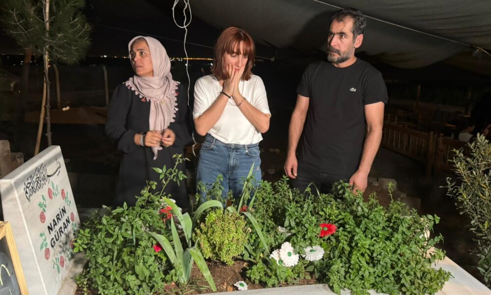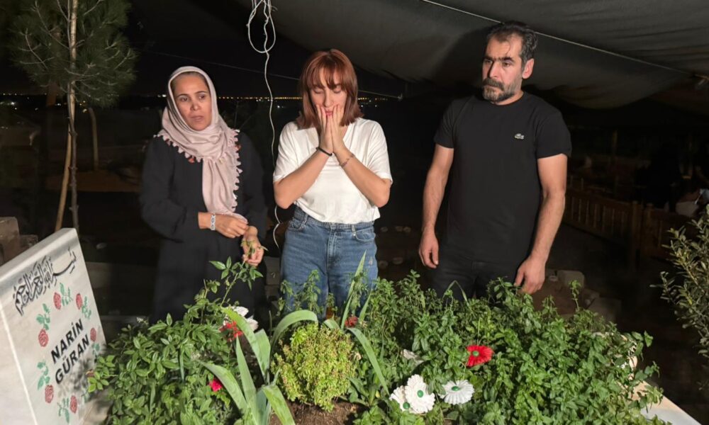 Diyarbakır'da Narin Güran cinayeti davasında tahliye edilen Birsen, Fuat ve Maşallah Güran,(sağda) Narin Güran’ın Tavşantepe Mahallesi’ndeki mezarı başına gelerek gözyaşları içerisinde dua etti. Fotoğraf: Diyarbakır,(DHA)