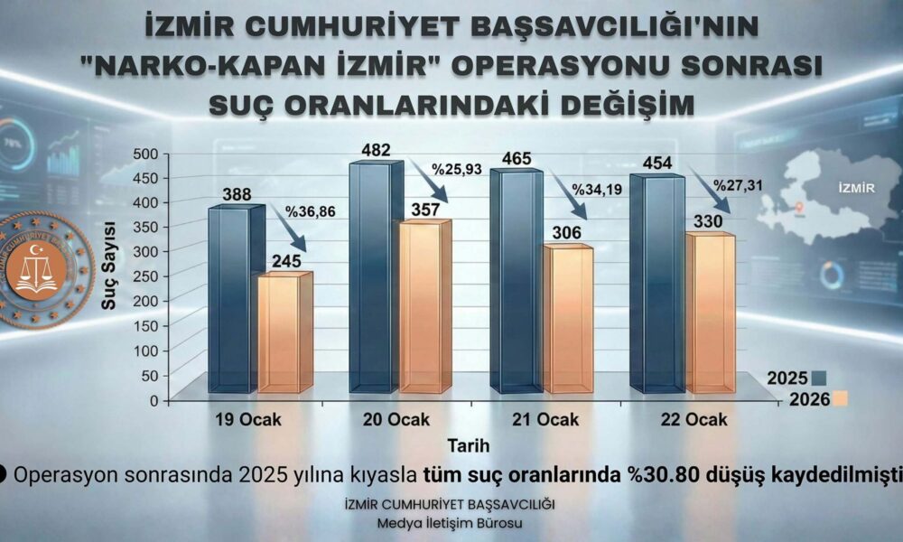 İzmir Cumhuriyet Başsavcılığı, Cumhuriyet tarihinin en büyük operasyonu olduğu belirtilen Narkokapan- İzmirin ardından geçen yılın aynı dönemine göre adli olaylarda yüzde 30 oranında azalma olduğunu duyurdu. Açıklamada 2025 yılında kentin huzur ve güvenliğini temin etmek amacıyla adalet hizmetlerinde kapsamlı bir dönüşüm süreci başlatıldığı vurgulanırken; İzmir Cumhuriyet Başsavcılığı olarak suçla mücadelede kararlılığı pekiştiren, süreçleri hızlandıran ve mağdur odaklı yaklaşımı güçlendiren uygulamaların hayata geçirildiğinin altı çizildi. Temel hedefin suçla mücadelenin her alanında etkinliği sağlamak, adalete erişimi hızlandırmak ve mağdurların korunmasına yönelik toplumsal farkındalığı güçlendirmek olduğu da vurgulandı.
