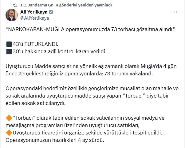 İçişleri Bakanı Ali Yerlikaya, Muğlada uyuşturucu satıcılarına yönelik jandarma tarafından düzenlenen Narkokapan-Muğla operasyonunu sosyal medya hesabından paylaştı. Buna göre; Torbacı olarak tabir edilen sokak satıcılarının sosyal medya ve mesajlaşma programları üzerinden uyuşturucu sattıkları, uyuşturucu ticaretini organize şekilde yürüttükleri tespit edildi. 4 ay süren hazırlıkların ardından gerçekleştirilen operasyona 512 jandarma timi, 2 komando timi, 5 motorlu asayiş timi katılırken, 6 özel eğitimli narkotik köpeği de operasyonda yer aldı. Bodrum, Dalaman, Datça, Fethiye, Kavaklıdere, Köyceğiz, Marmaris, Menteşe, Milas, Ortaca, Seydikemer, Ula ve Yatağan ilçelerinde yürütülen eş zamanlı baskınlarda 73 şüpheli gözaltına alındı. Şüphelilerden 43ü tutuklandı, 30u hakkında adli kontrol kararı verildi.