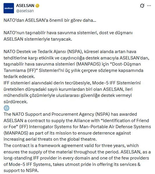 ASELSANın sanal medya hesabından yapılan açıklamada, “NATOdan ASELSANa önemli bir görev daha. NATOnun taşınabilir hava savunma sistemleri, dost ve düşmanı ASELSAN sistemleriyle tanıyacak. NATO Destek ve Tedarik Ajansı (NSPA), küresel alanda artan hava tehditlerine karşı etkinlik ve caydırıcılığa destek amacıyla ASELSANdan, taşınabilir hava savunma sistemleri (MANPADS) için IFF Sistemlerini üç yıllık çerçeve sözleşme kapsamında tedarik edecek. IFF sistemleri alanındaki derin tecrübesiyle, Mode-5 IFF Sistemlerini üretebilen dünyadaki sayılı kurumlardan biri olan ASELSAN, ileri mühendislik çözümleriyle uluslararası güvenliğe destek vermeyi sürdürecek” denildi.