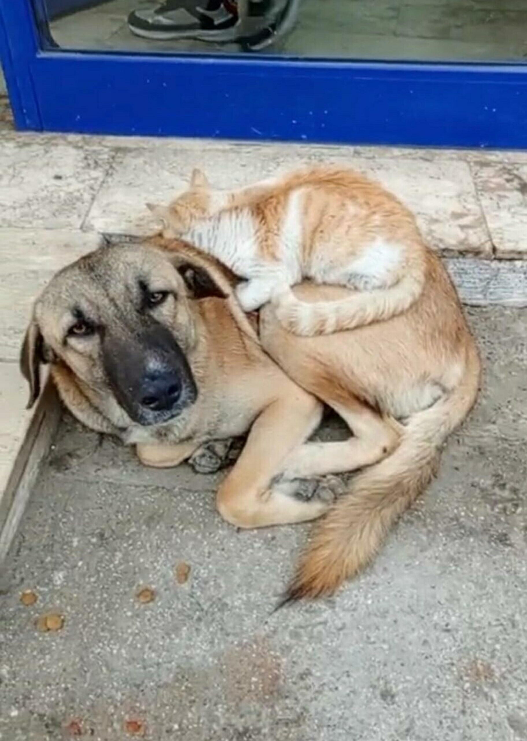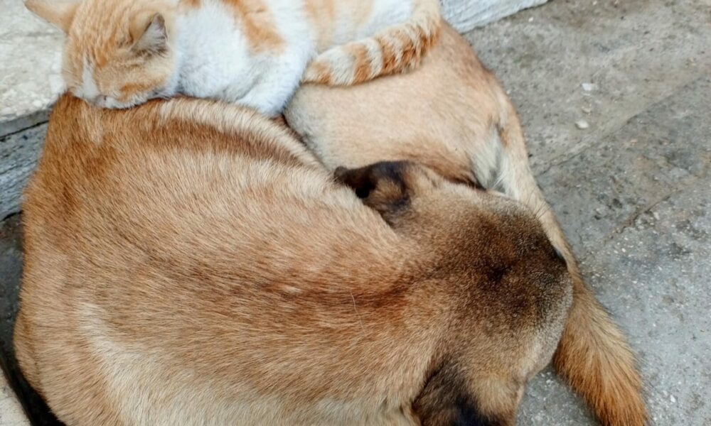 Nazilli Cumhuriyet Mahallesi’nde Hükümet Konağı giriş kapısı yakınında soğuk havada bir kedi ile köpeğin koyun koyuna yatması görenleri şaşırtıyor. Aynı kaptan mama yiyip, zaman zaman köpeğin sırtında uyuyan kedi dikkat çekiyor. İki hayvan arasındaki bağ, çevredekiler tarafından cep telefonu kamerasıyla görüntülendi.