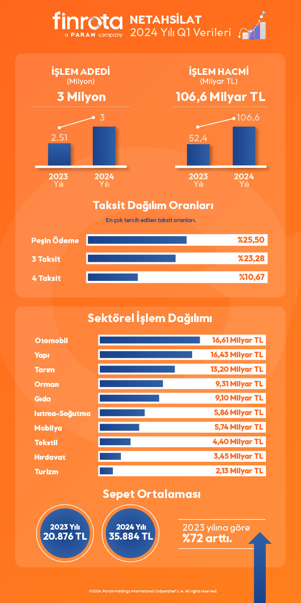 Netahsilat online tahsilat hacmi bir önceki yılın ilk çeyreği ile karşılaştırıldığında yüzde 104 oranında büyüyerek 106,6 milyar TL olurken, işlem adedi ise bir önceki yılın aynı dönemine göre yüzde 18 artarak 3 milyona ulaştı.