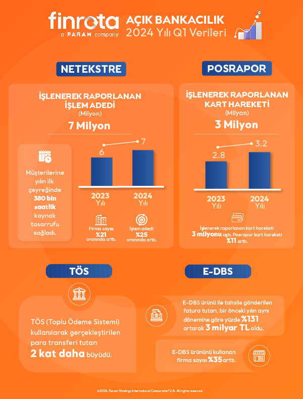 Uzunoğlu, “Bir diğer açık bankacılık ürünümüz olan Posraporda işlenerek raporlanan kart hareketi 2024 yılında bir önceki yılın aynı dönemine göre yüzde 11 artarak 3 milyonu aştı. E-DBS ürünümüz ile tahsile gönderilen fatura tutarı, bir 2023ün aynı dönemine göre yüzde 131 artarak 3 milyar TL oldu. TÖS’ün (Toplu Ödeme Sistemi) transfer hacmi ise yılın ilk çeyreğinde 2 kat artış gösterdi. Tüm bu veriler Finrotanın sektördeki güçlü konumunu ve sunduğu hizmetlerin faydalarını yansıtıyor. Yılın ilk çeyreğinde açık bankacılık çözümlerimizde elde ettiğimiz büyüme oranları, sektördeki güçlü konumumuzu pekiştirirken bizleri hedeflerimizi gerçekleştirme yolunda daha da motive ediyor. Açık bankacılık hizmetlerimize çok yakında yapay zeka tabanlı yeni bir finansal raporlama ürünü daha ekleyeceğiz. Bu ürünümüz; gelir, gider tahminlemeleri yapabilecek, geçmiş işlemleri ve ödemeleri inceleyebilecek, raporlar ve analizler sunacak. Kısacası kullanıcılarının karar alma süreçlerini kolaylaştıracak. Her bir açık bankacılık hizmetimizle daha çok kullanıcının ve iş ortağının dijital dönüşümüne katkı sağlayacağız. Fark yaratan finansal çözümlerimizle finansal teknolojinin rotasını çizmeye devam edeceğiz” dedi.
